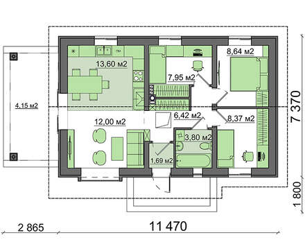 Маленький одноэтажный дом можно использовать не только как дачу, но и как постоянное жилье. Компактность, простая форма дома и двускатной крыши позволяет быстро и экономно вести строительство. Такой проект просто идеально подходит для молодой семьи.