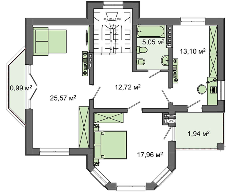 Проект содержит три раздела – АрхитектурныйКонструктивный и Инженерный: водоснабжение, отопление, вентиляция, канализация, электроснабжение (приобретается за дополнительную плату) + Пояснительная записка.