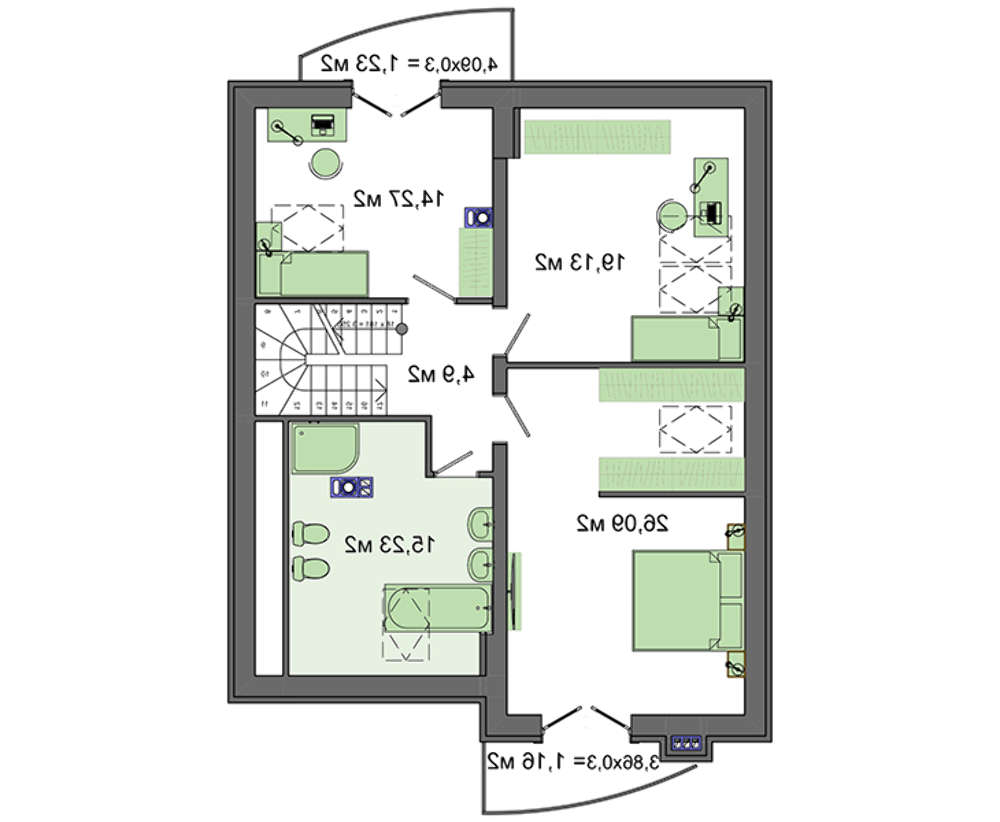 На верхнем этаже находятся апартаменты хозяина с гардеробом и личным балконом, две спальни различной площади. Просторная ванная комната оснащена современным сантехническим оборудованием.