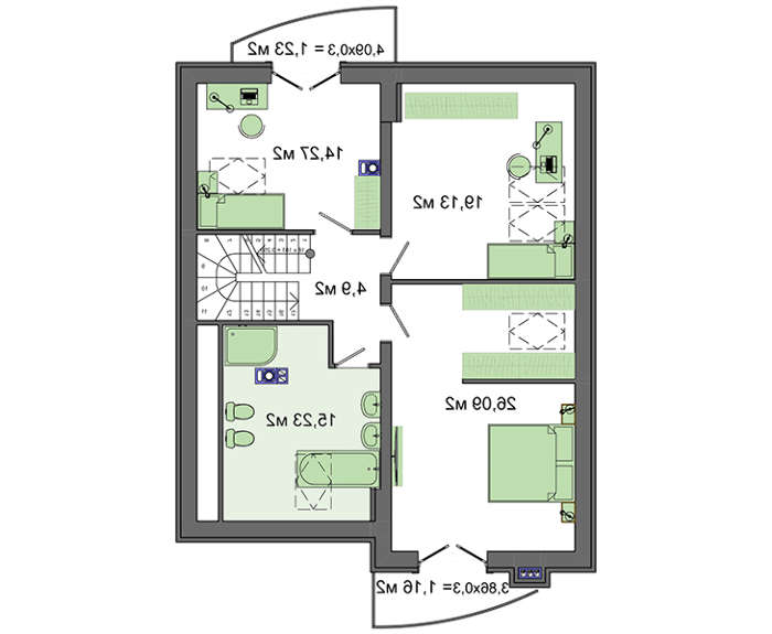 Проект содержит три раздела – Архитектурный, Конструктивный и Инженерный: водоснабжение, отопление, вентиляция, канализация, электроснабжение (приобретается за дополнительную плату) + Пояснительная записка.