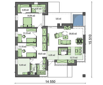 Проект содержит три раздела – Архитектурный, Конструктивный и Инженерный: водоснабжение, отопление, вентиляция, канализация, электроснабжение (приобретается за дополнительную плату) + Пояснительная записка.