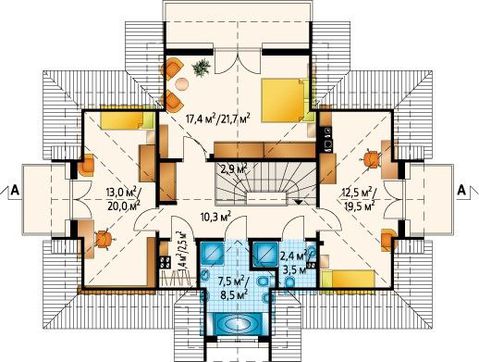 Особенность этажа в небольшой, но отдельной комнате. Здесь легко помещается кабинет, уединенность поможет превратить пространство в спальню. Шумные игры малышей, если вы решитесь на детскую, не смогут никому помешать отдыхать.