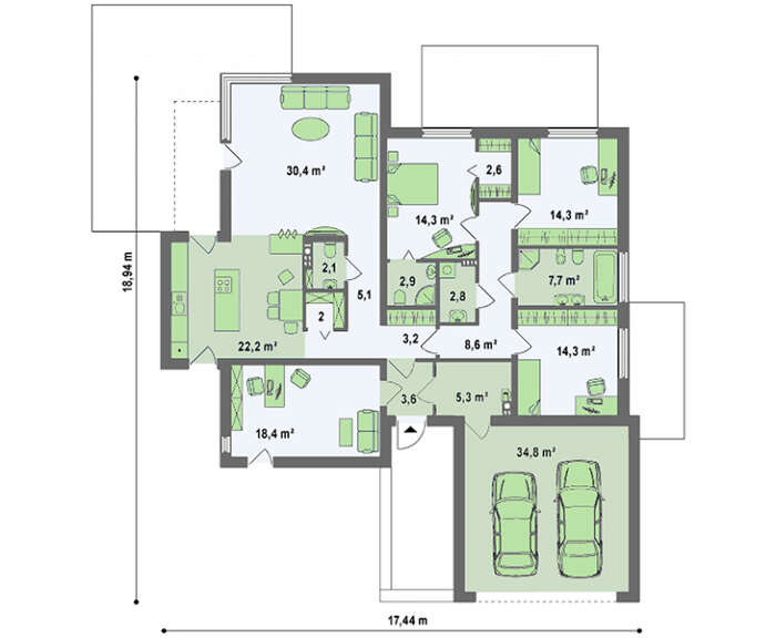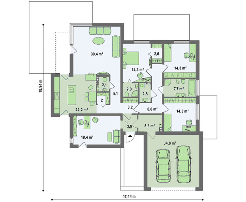 Проект содержит три раздела – Архитектурный, Конструктивный и Инженерный: водоснабжение, отопление, вентиляция, канализация, электроснабжение (приобретается за дополнительную плату) + Пояснительная записка.