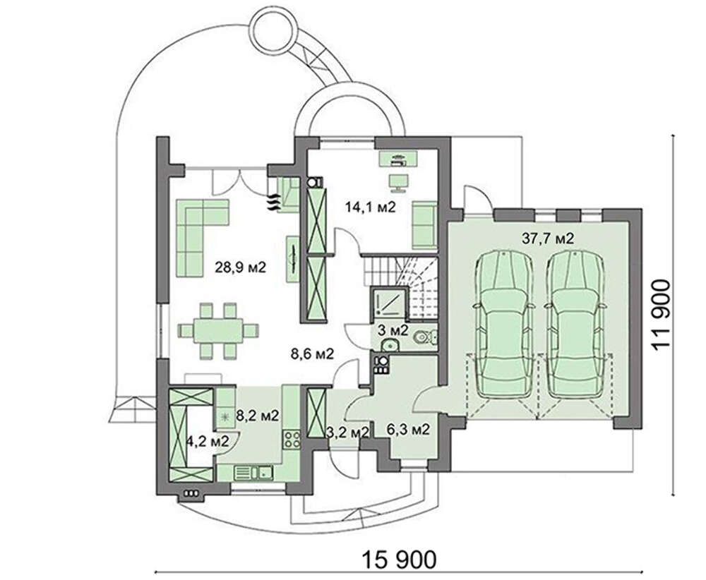 Восхитительный коттедж с полукруглыми балконами и гаражом на два автомобиля