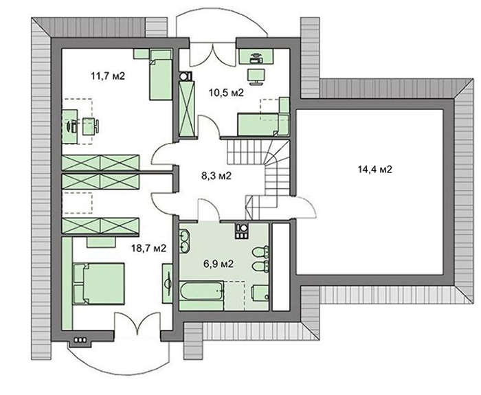 Проект содержит три раздела – АрхитектурныйКонструктивный и Инженерный: водоснабжение, отопление, вентиляция, канализация, электроснабжение (приобретается за дополнительную плату) + Пояснительная записка.
