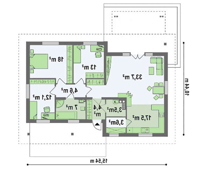 Проект одноэтажного дома с многоскатной крышей – это практичный дом в традиционном стиле с функциональным интерьером. В нем с комфортом разместится семья из четырех человек.