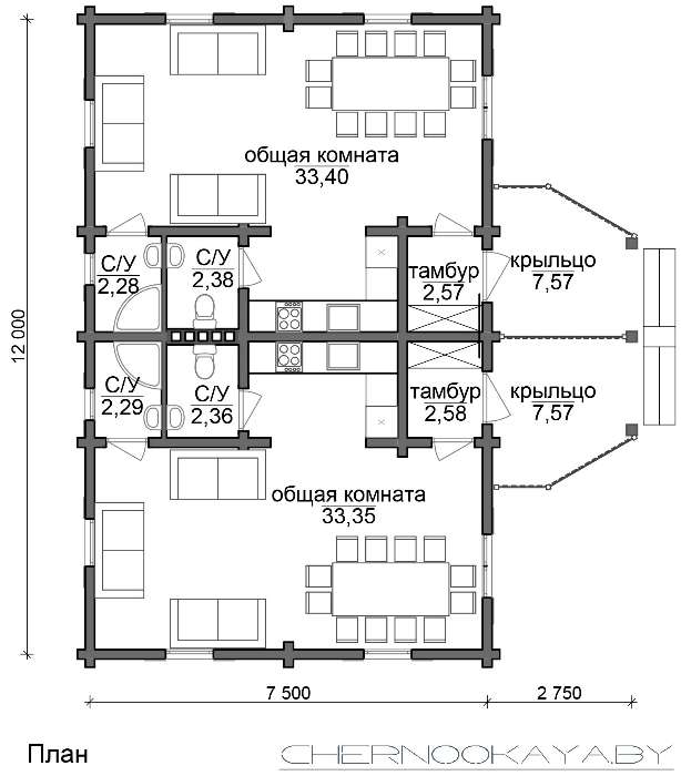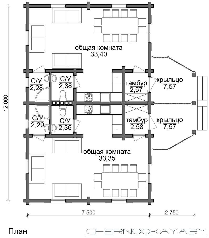 Проект содержит три раздела – Архитектурный, Конструктивный и Инженерный: водоснабжение, отопление, вентиляция, канализация, электроснабжение (приобретается за дополнительную плату) + Пояснительная записка.