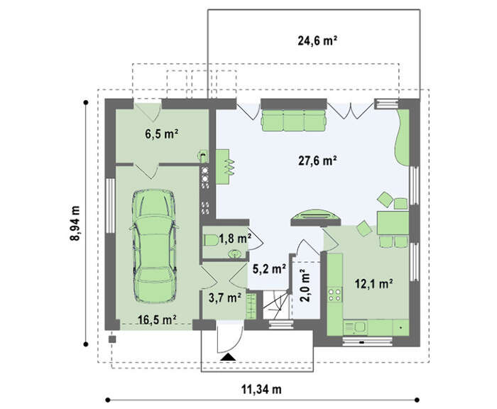 Первый этаж занимают помещения общего назначения: гостиная с камином и выходом на террасу, столовая и просторная кухня с удобной кладовой. L-образная конфигурация дневной зоны позволяет разделить это пространство на функциональные блоки. Но при этом сохраняется их единство. А за счет большого количества окон, дневная зона является светлым и уютным помещением.