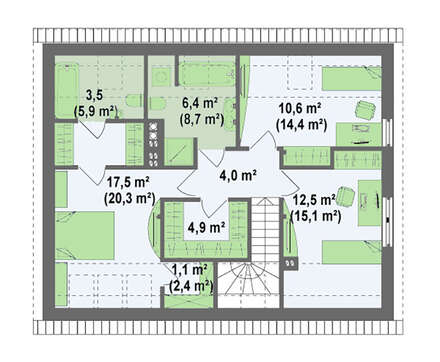 Эти приватные пространства дополняет общая ванная с прачечной. Еще одно подсобное помещение можно использовать как гардеробную или кладовую. А можно вообще отказаться от него и устроить на его месте дополнительную рекреативную зону.