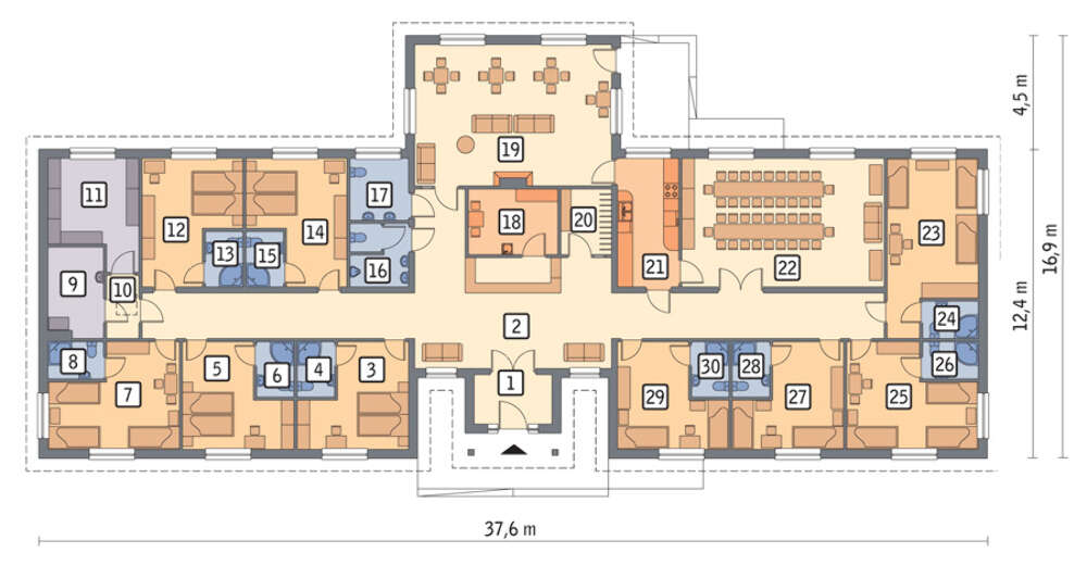 Проект содержит три раздела – Архитектурный, Конструктивный и Инженерный: водоснабжение, отопление, вентиляция, канализация, электроснабжение (приобретается за дополнительную плату) + Пояснительная записка.