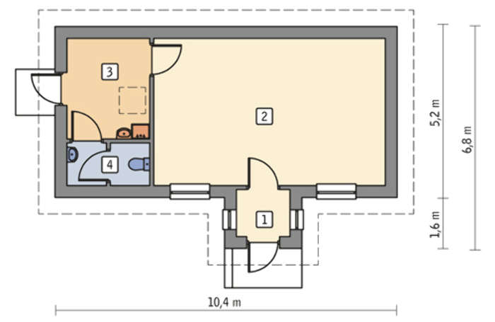 Проект содержит три раздела – Архитектурный, Конструктивный и Инженерный: водоснабжение, отопление, вентиляция, канализация, электроснабжение (приобретается за дополнительную плату) + Пояснительная записка.