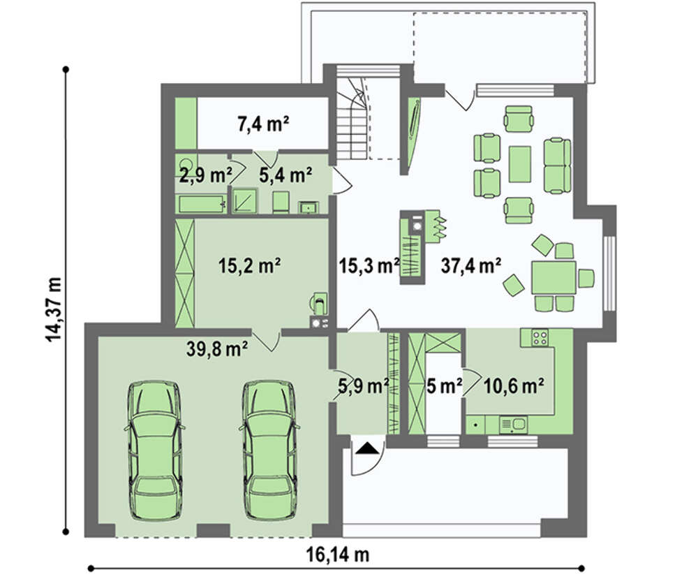 С фронтальной стороны спроектирован большой гараж на две машины. В подсобном помещении, примыкающем к нему, логично будет оборудовать мастерскую.