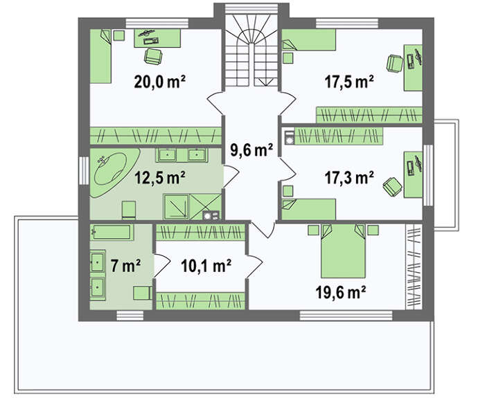 Мансарда отведена под ночную зону. Она включает в себя четыре спальни и общую ванную комнату. При этом, самая большая спальня оборудована собственной ванной и гардеробную.