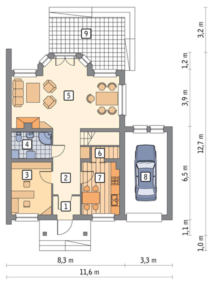 Проект содержит три раздела – Архитектурный, Конструктивный и Инженерный: водоснабжение, отопление, вентиляция, канализация, электроснабжение (приобретается за дополнительную плату) + Пояснительная записка.